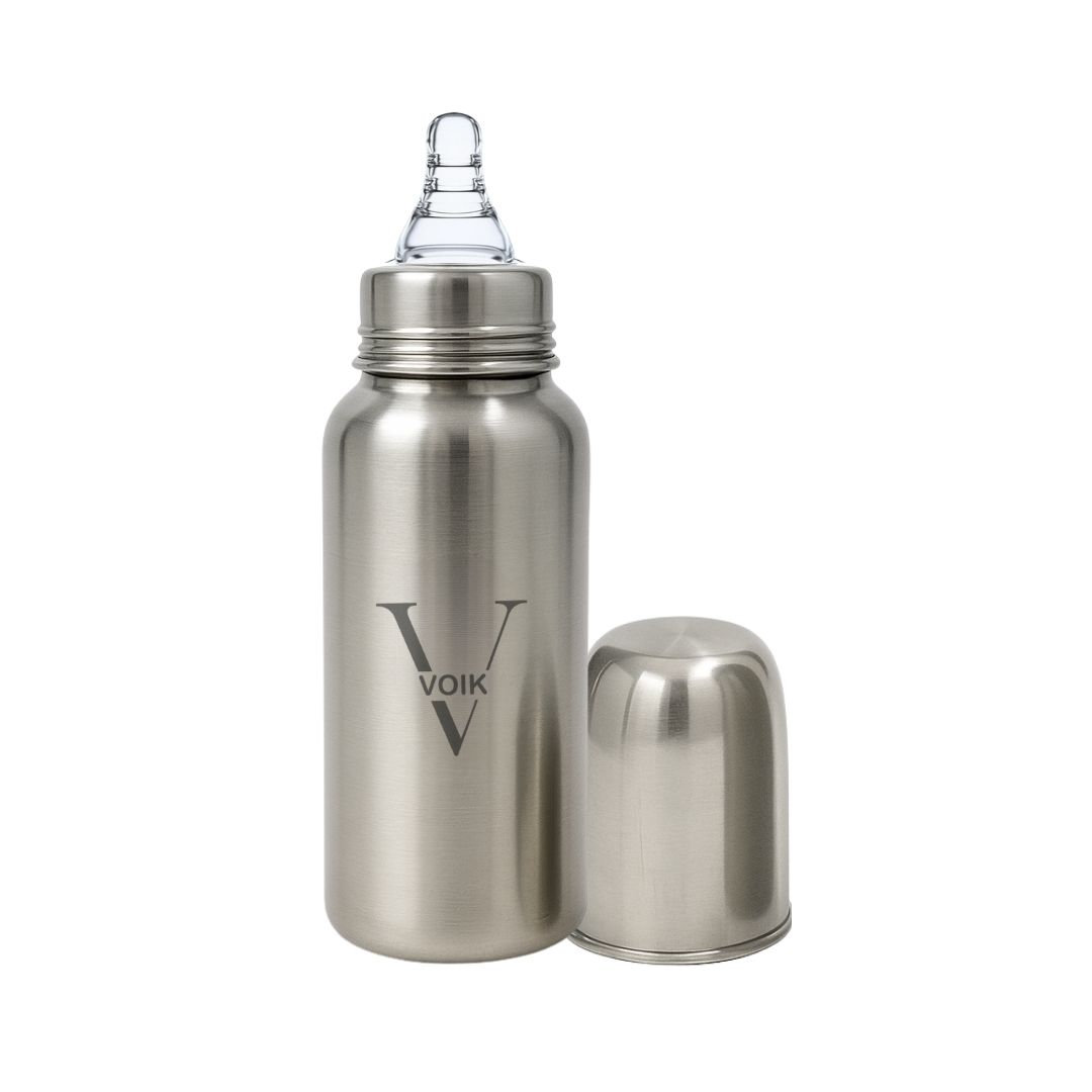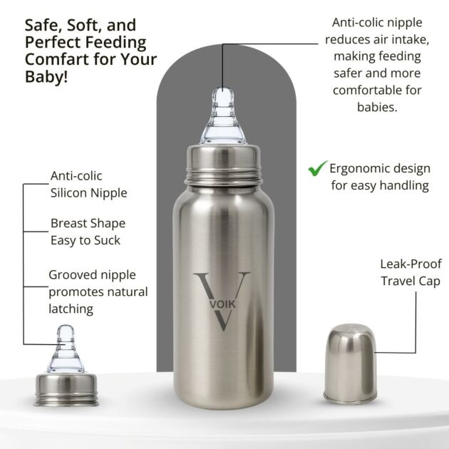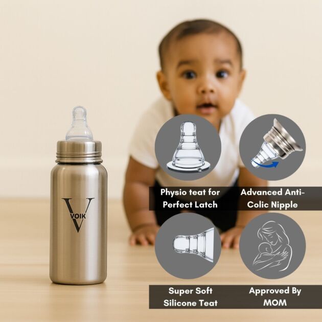 The VOIK Stainless Steel Baby Feeding Bottle is thoughtfully designed with your baby’s safety and comfort in mind. Made from SS 304 food-grade stainless steel, it offers a safe and eco-friendly alternative to plastic bottles. The bottle is ISI certified, ensuring high standards of quality and hygiene. Its lightweight, durable body with a narrow neck design makes it easy to hold and feed, both for parents and babies. The soft anti-colic silicone nipple helps reduce gas and fussiness, providing a smooth and comfortable feeding experience. Completely BPA-free, toxin-free, odour-free, and rust-resistant, this bottle keeps your baby’s milk safe and fresh. Strong, leak-proof, and easy to clean, it is perfect for everyday use at home or while traveling. Make feeding safe and convenient with VOIK – nurturing with steel strength.
