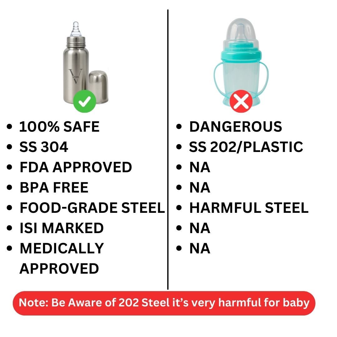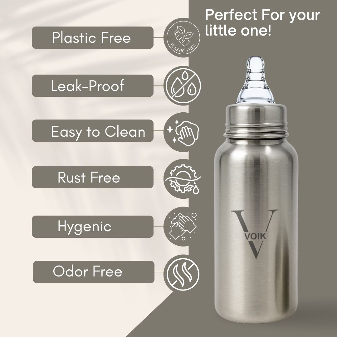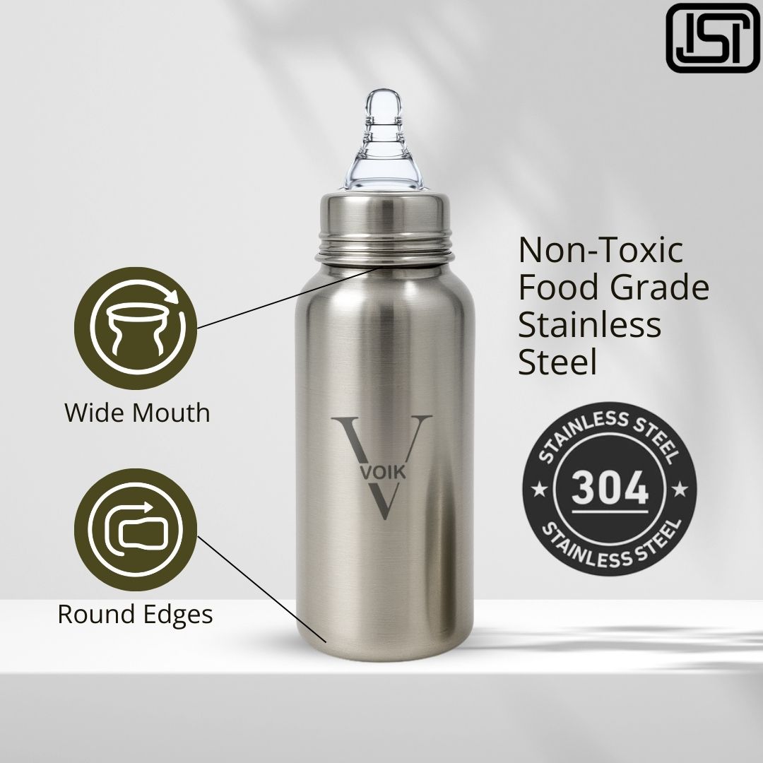 VOIK Stainless Steel Baby Feeding Bottle 240ml | 100% Steel | for 3+ Months Babies