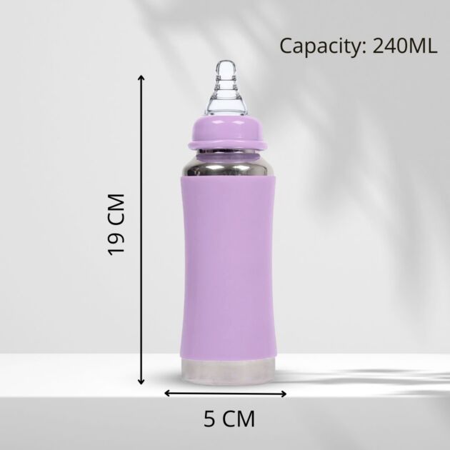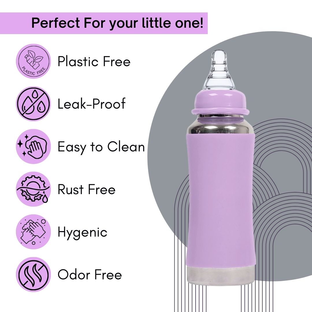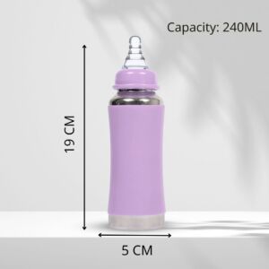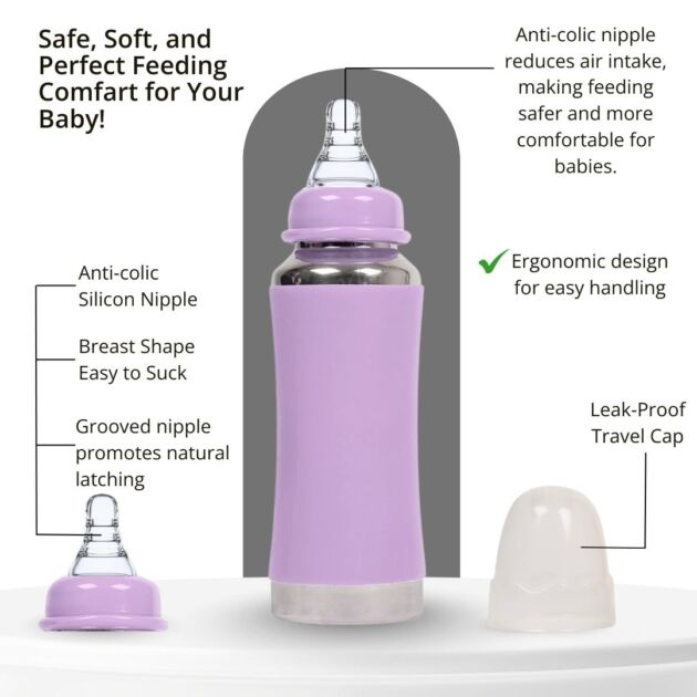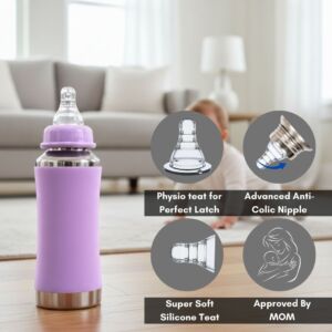 The Vega JOY Stainless Steel Baby Feeding Bottle is thoughtfully designed to provide your baby with a safe, hygienic, and eco-friendly feeding experience. Crafted from ISI-approved, SS 304 food-grade stainless steel, this 240 ml bottle is strong, durable, and built for everyday use. It is completely BPA-free, non-toxic, odour-free, and taste-free, ensuring your baby’s milk stays fresh and uncontaminated without harmful chemicals. The lightweight and easy-to-hold design offers comfort for both parents and babies, while the soft silicone nipple with an anti-colic vent system helps reduce air intake, minimizing gas and discomfort during feeding. Its leak-proof and rust-resistant construction makes it perfect for use at home or on the go. A thoughtful gift for new parents and an essential addition to any baby care routine, the Vega JOY bottle supports safe and sustainable parenting. Suitable for liquids at normal temperature, this bottle is non-insulated and ideal for daily feeding needs. Choose Vega JOY for joyful moments with your baby and a healthier planet.