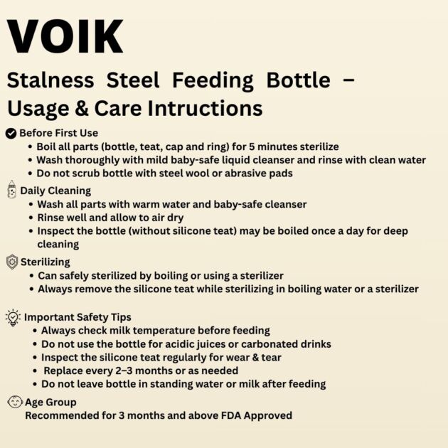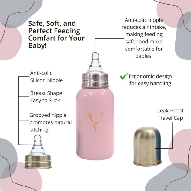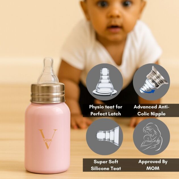 Introducing the VOIK Vega Soft Steel Feeding Bottle – the smarter and safer choice for your little one. Crafted from premium SS 304 food-grade stainless steel, this bottle is designed to provide superior safety, durability, and hygiene for your baby’s everyday feeding needs. Unlike traditional plastic bottles, it is BPA-free, toxin-free, and odour-free, helping keep your baby’s milk fresh and uncontaminated. The lightweight body makes it easy for tiny hands to hold, while the soft-flow silicone nipple offers a natural, breast-like feeding experience for added comfort. Built to last, the VOIK Vega bottle is strong, dent-resistant, and 100% leak-proof, making it perfect for daily use at home or during travel. Finished with a stylish matte blue design, it’s not just a bottle but a thoughtful choice for your baby’s health and safety.