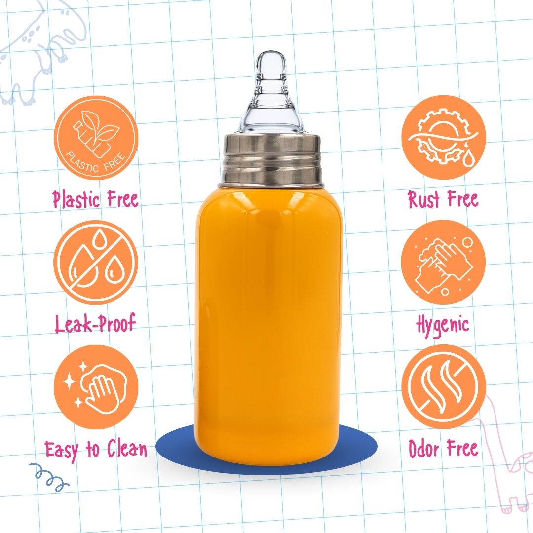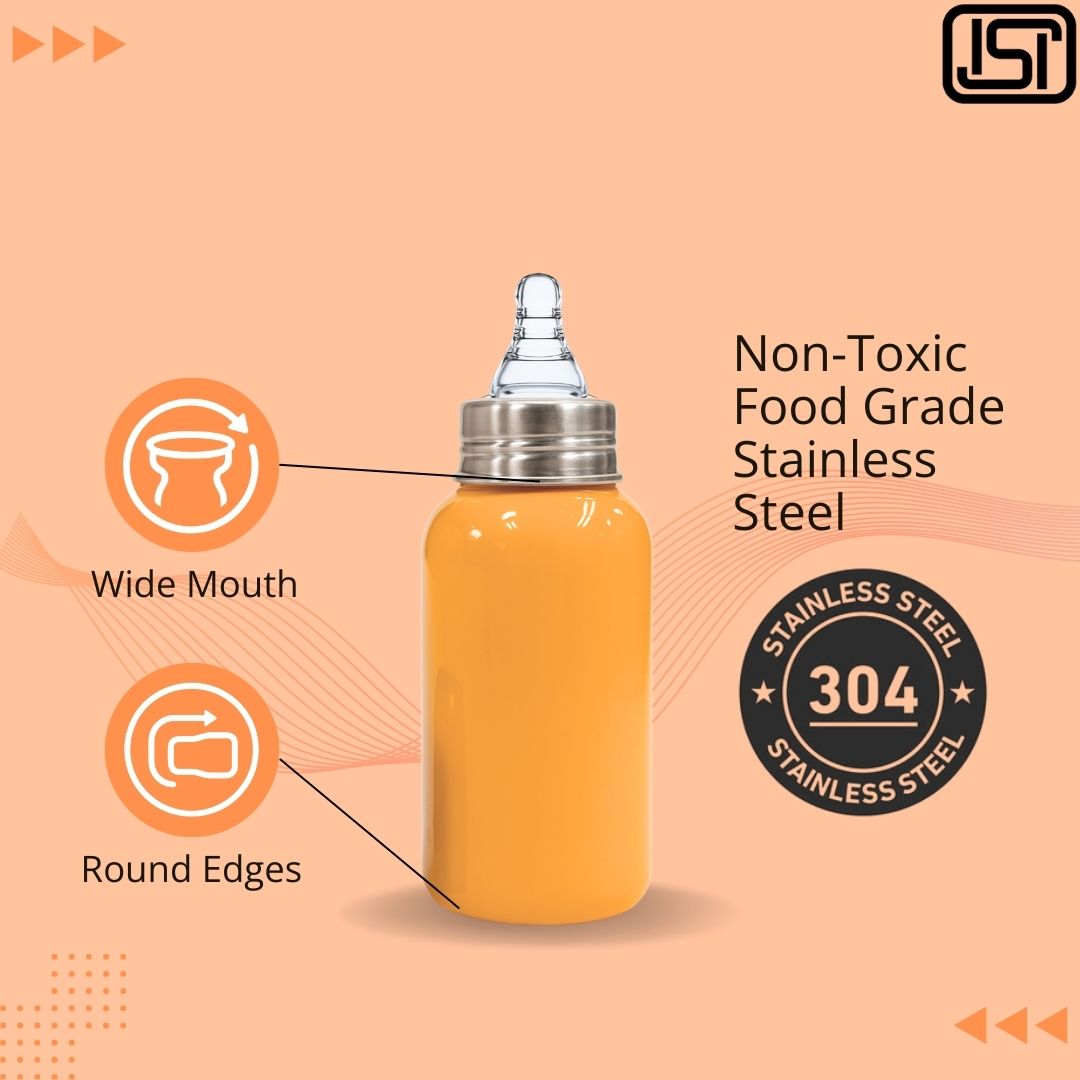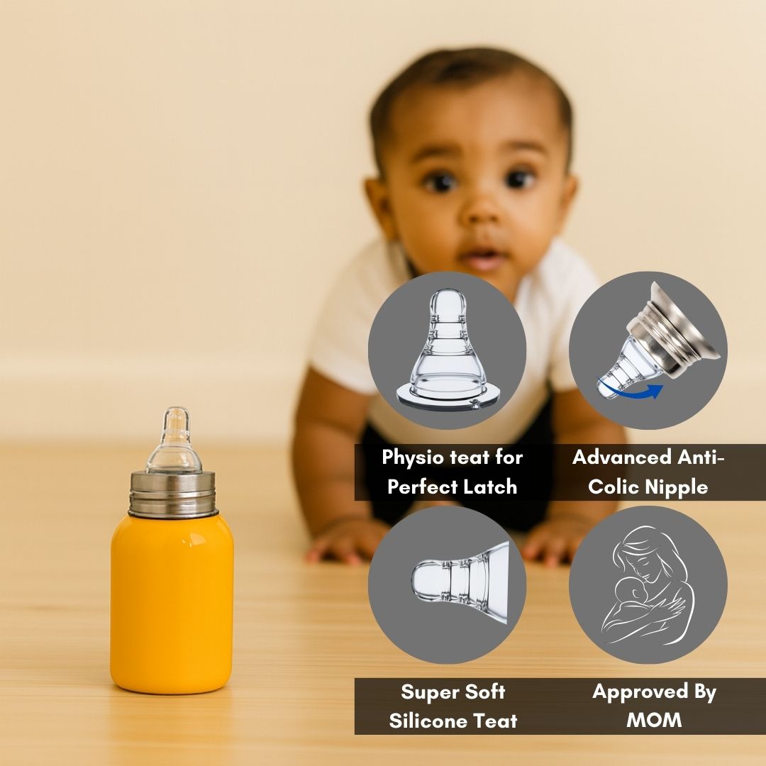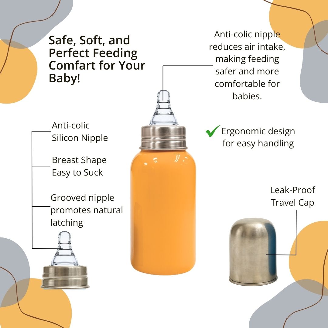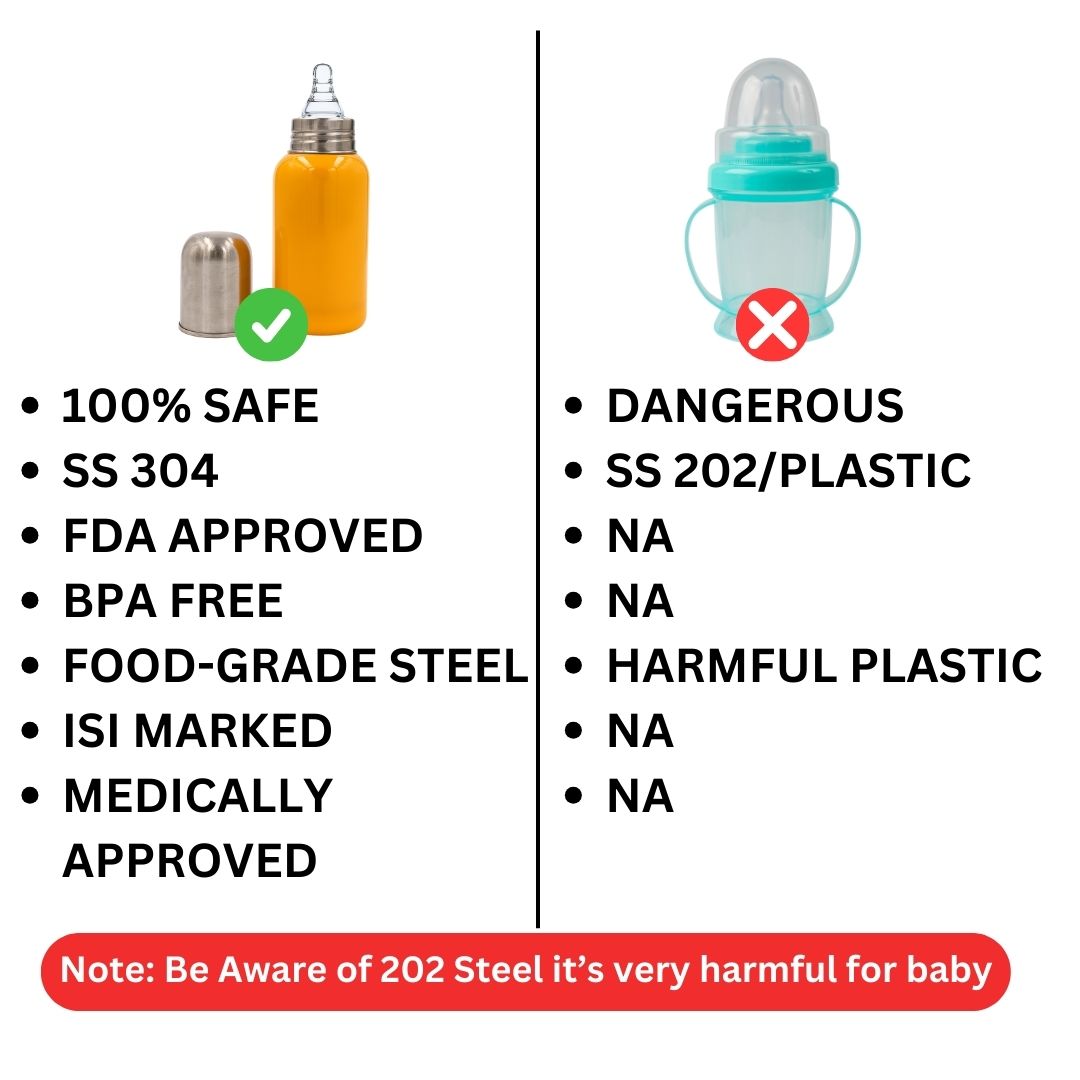 Introducing the VOIK Vega Soft Steel Feeding Bottle – the smarter and safer choice for your little one. Crafted from premium SS 304 food-grade stainless steel, this bottle is designed to provide superior safety, durability, and hygiene for your baby’s everyday feeding needs. Unlike traditional plastic bottles, it is BPA-free, toxin-free, and odour-free, helping keep your baby’s milk fresh and uncontaminated. The lightweight body makes it easy for tiny hands to hold, while the soft-flow silicone nipple offers a natural, breast-like feeding experience for added comfort. Built to last, the VOIK Vega bottle is strong, dent-resistant, and 100% leak-proof, making it perfect for daily use at home or during travel. Finished with a stylish matte blue design, it’s not just a bottle but a thoughtful choice for your baby’s health and safety.