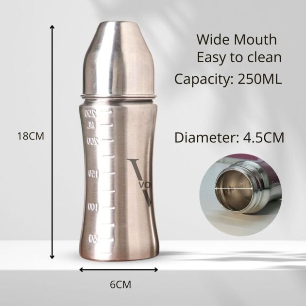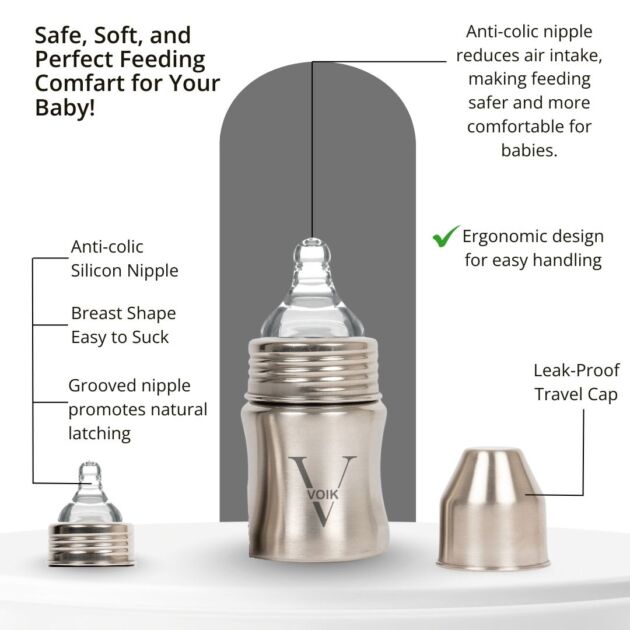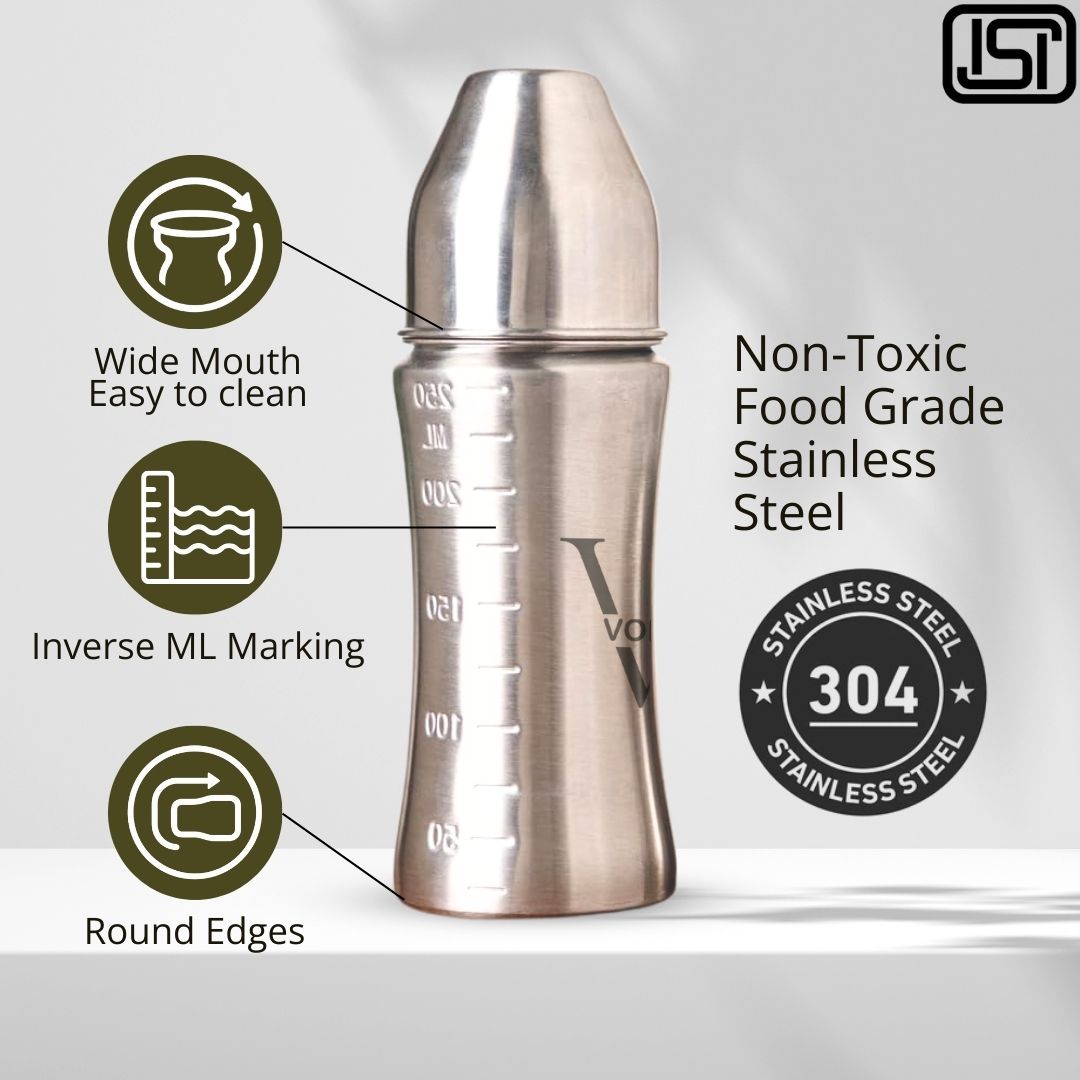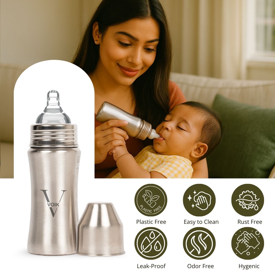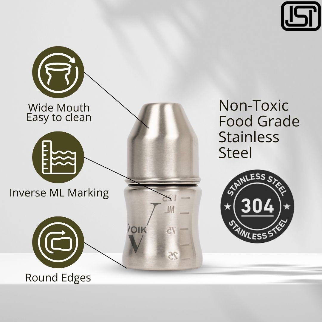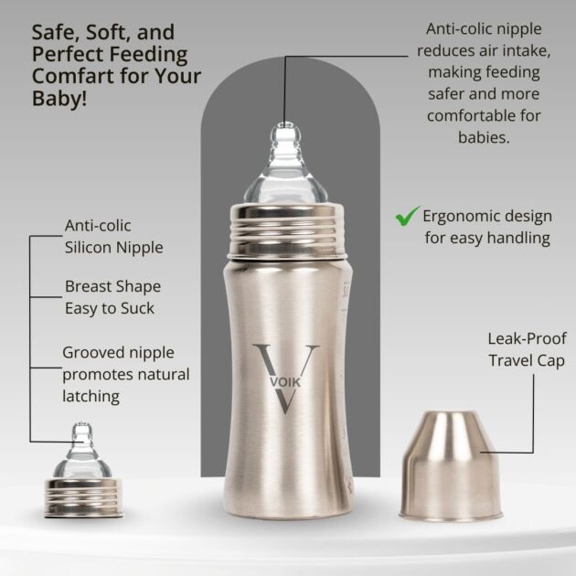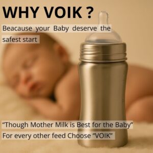The VOIK stainless steel milk bottle for babies is thoughtfully designed using ISI-approved, SS 304 food-grade stainless steel to ensure complete safety and hygiene for your little one. Its strong yet lightweight body features a smooth, jointless design that is easy to clean and comfortable to hold, making feeding convenient for both parents and babies. The bottle comes with a soft silicone teat that provides a gentle and natural feeding experience, while the anti-colic vent system helps reduce air intake to minimize gas and discomfort. Made from BPA-free, non-toxic, odour-free, and taste-free materials, this bottle keeps your baby’s milk safe and fresh. Perfect for everyday feeding at home or on the go, the VOIK steel milk bottle is a durable and reliable choice for your baby’s needs.