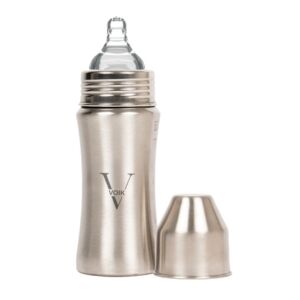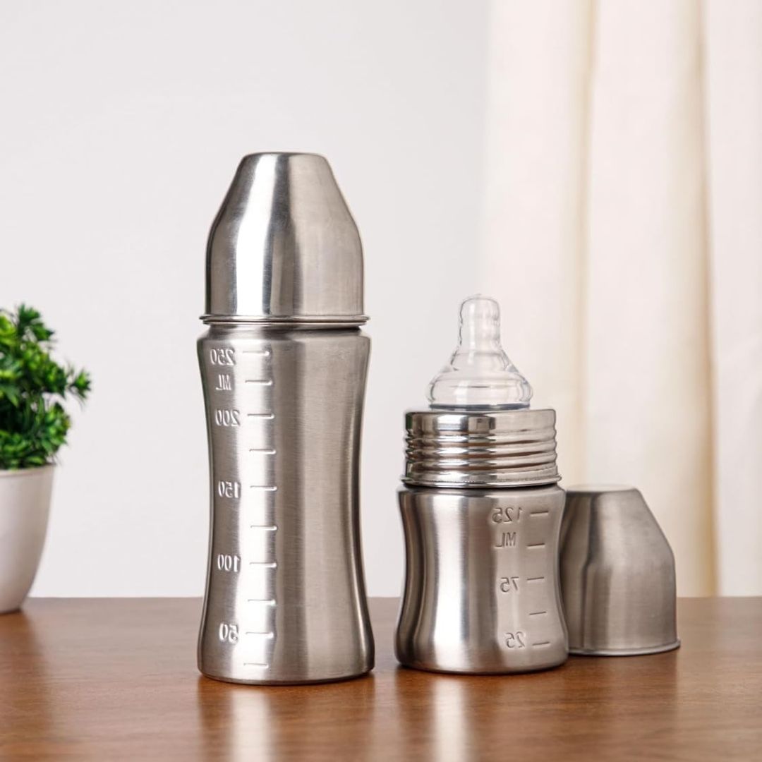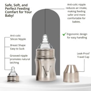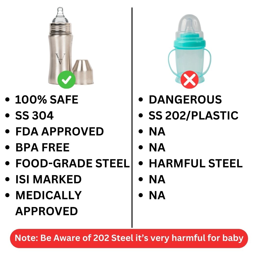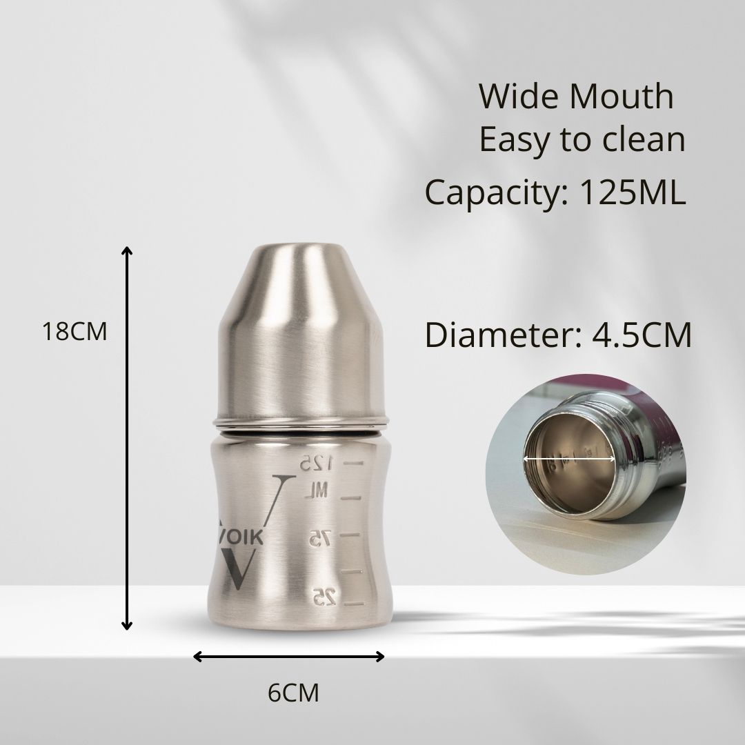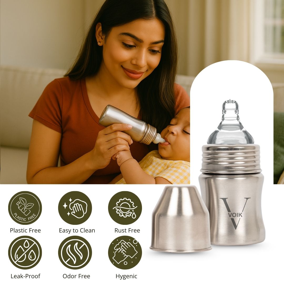 The VOIK stainless steel milk bottle for babies is thoughtfully designed using ISI-approved, SS 304 food-grade stainless steel to ensure complete safety and hygiene for your little one. Its strong yet lightweight body features a smooth, jointless design that is easy to clean and comfortable to hold, making feeding convenient for both parents and babies. The bottle comes with a soft silicone teat that provides a gentle and natural feeding experience, while the anti-colic vent system helps reduce air intake to minimize gas and discomfort. Made from BPA-free, non-toxic, odour-free, and taste-free materials, this bottle keeps your baby’s milk safe and fresh. Perfect for everyday feeding at home or on the go, the VOIK steel milk bottle is a durable and reliable choice for your baby’s needs.